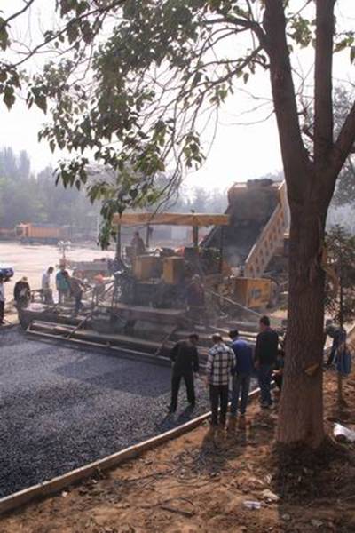 圖1—2為攤鋪機(jī)械正在跑道上進(jìn)行鋪設(shè)作業(yè)的場景