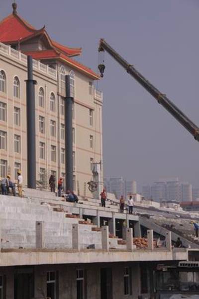 圖3為繁忙的看臺(tái)吊裝施工的場景
