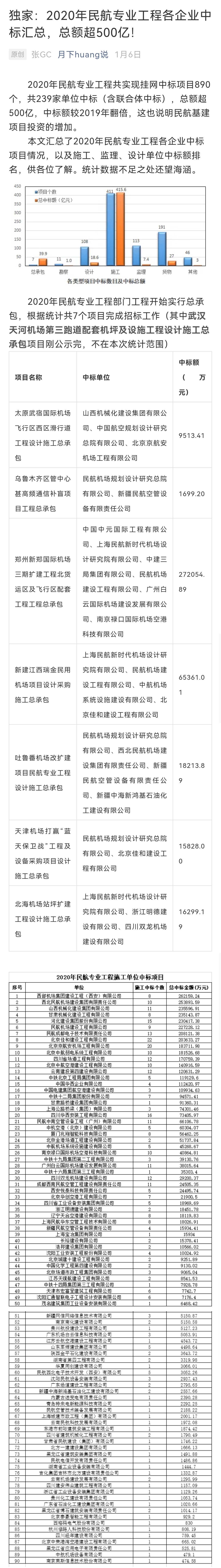 2020年民航專業(yè)工程共實現(xiàn)掛網(wǎng)中標項目890個,共239家單位中標(含聯(lián)合體中標),總額超500億。我公司民航專業(yè)工程中標項目共8個,中標總金額235143.87萬元,位居全國第四。