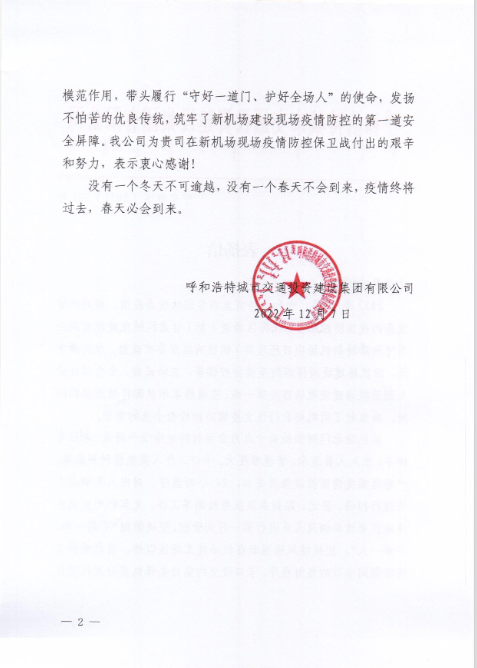 2022年12月7日,呼和浩特市交通投資建設(shè)集團有限公司給我司發(fā)來表揚信,表揚信中充分肯定了我司呼和浩特新機場項目部在疫情防控工作上作出的努力,展現(xiàn)了我司的社會責(zé)任與擔(dān)當(dāng)。